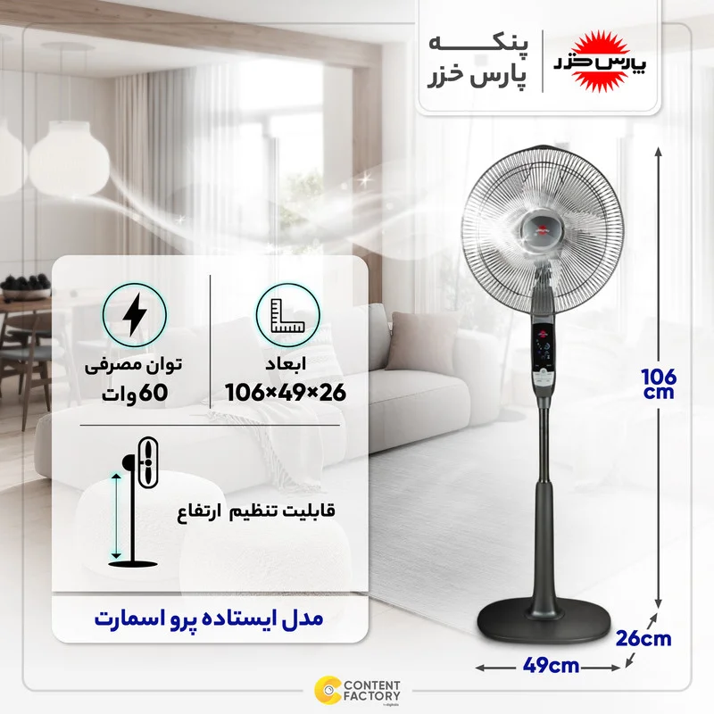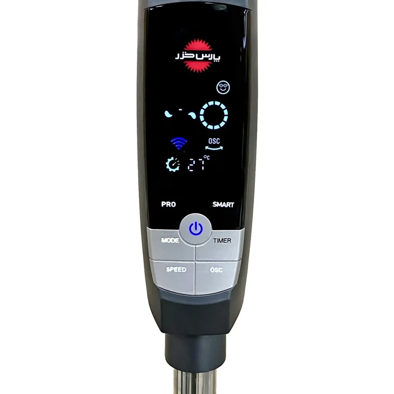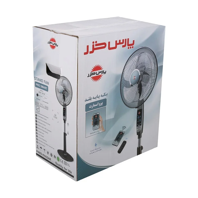 پنکه ایستاده پارس خزر Pro Smart بدون WiFiپنکه ایستاده پارس خزر Pro Smart بدون WiFi از محصولات با کیفیت شرکت پارس خزر می باشد که طراحی زیبایی دارد.این محصول دارای 4 پره پلاستیکی با حجم باد دهی 56 متر مکعب بر دقیقه می باشد.پنکه پارس خزر دارای پایه استیل با قابلیت تنظیم ارتفاع بهره می برد همچنین بر روی بدنه این محصول صفحه کیبورد لمسی تعبیه شده که امکان تنظیم سرعت بر حسب نیاز را به کاربر می دهد.سر پنکه به صورت اتوماتیک به سمت چپ و راست حرکت می کند که به کارایی این دستگاه می افزاید.توسط دکمه ی لمسی که برای این محصول تعبیه شده می توان حالت چرخش افقی این پنکه را فعال یا غیر فعال کرد.در مجموع طراحی زیبا و مستحکم پنکه پارس خزر، این پنکه را مناسب برای هر محیطی از جمله منازل و ادارات می کند که می توان آن را گزینه ای مطلوب در نظر داشت.قطعات پلاستیکی استفاده شده در این دستگاه باعث کاهش وزن آن شده و ساخت پایه با وزن مناسب مانع از واژگونی پنکه می شود.پایه اصلی پنکه از وزنه تعادلی بهره می برد که در سطوح شیبدار بالاترین ایستایی را دارد.